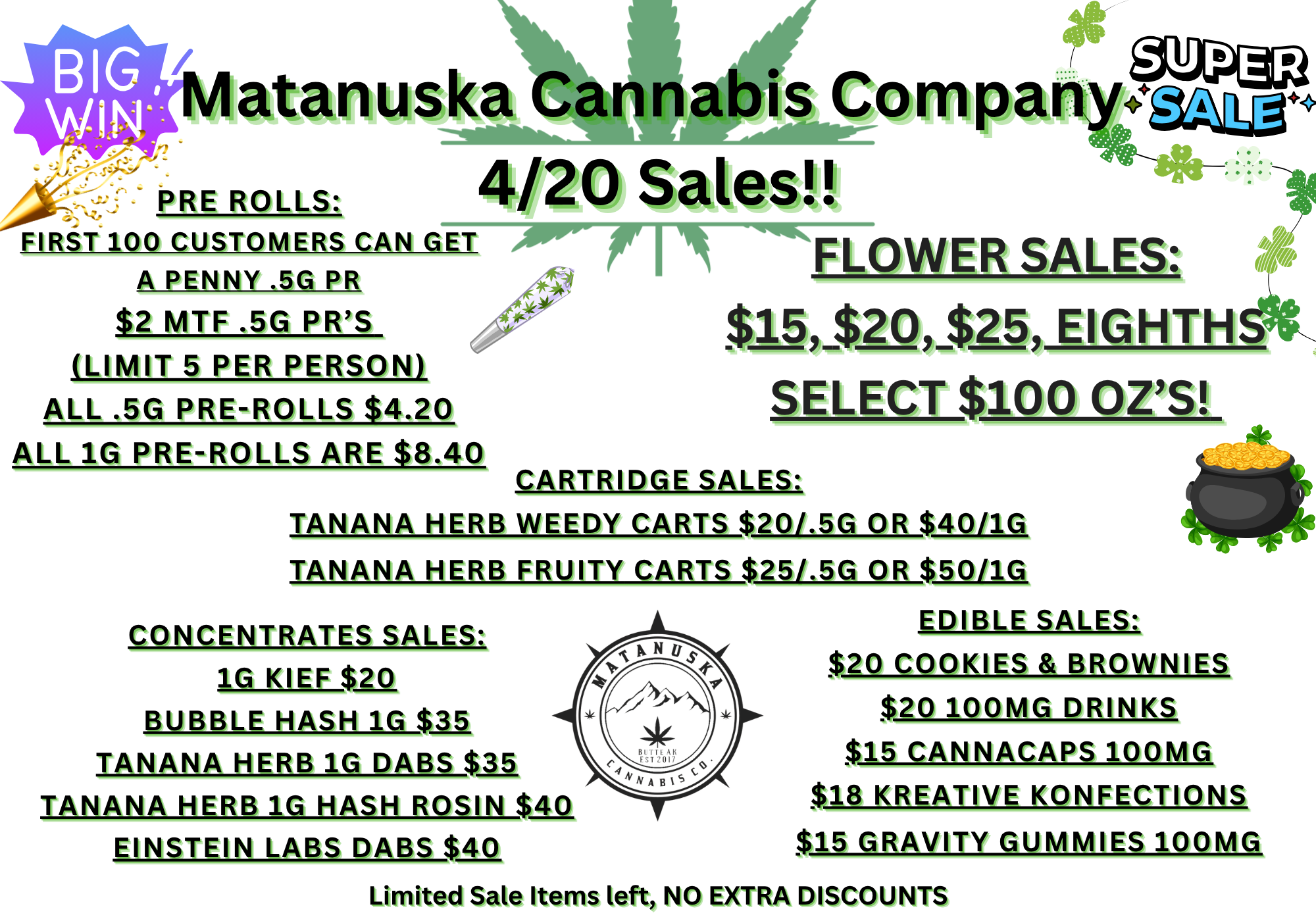 We at Matanuska Cannabis Co. believe in quality and customer service! That’s why we offer not only our own premium cannabis grown in-house, but also the best available from growers across Alaska. We offer specials weekly and are always changing our menu to make sure you always have new choices!